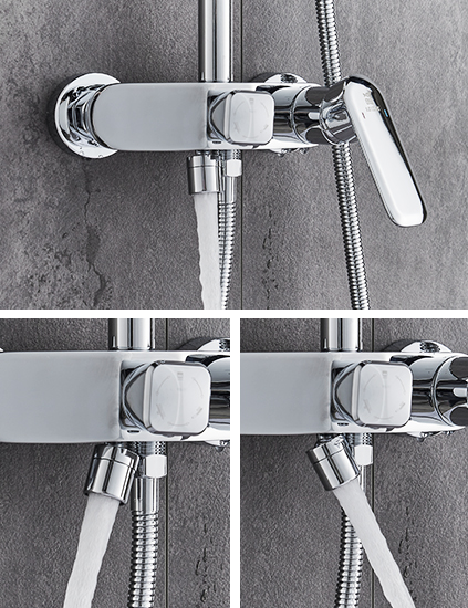 ? 方形一鍵三功能,頂噴水、花灑水、下出水切換自如。